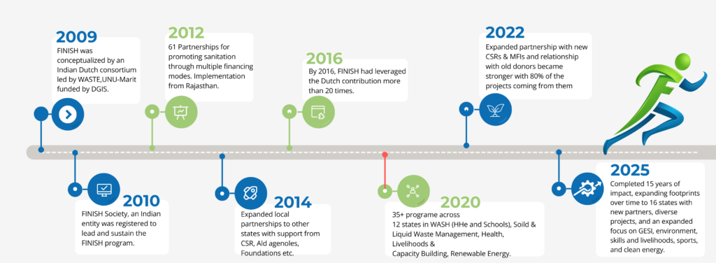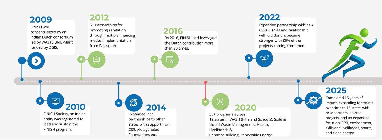 FINISH was conceptualized by an Indian–Dutch consortium led by WASTE and UNU-Merit. The initiative was funded by DGIS. The vision: promote safe sanitation through sustainable financing and partnerships.